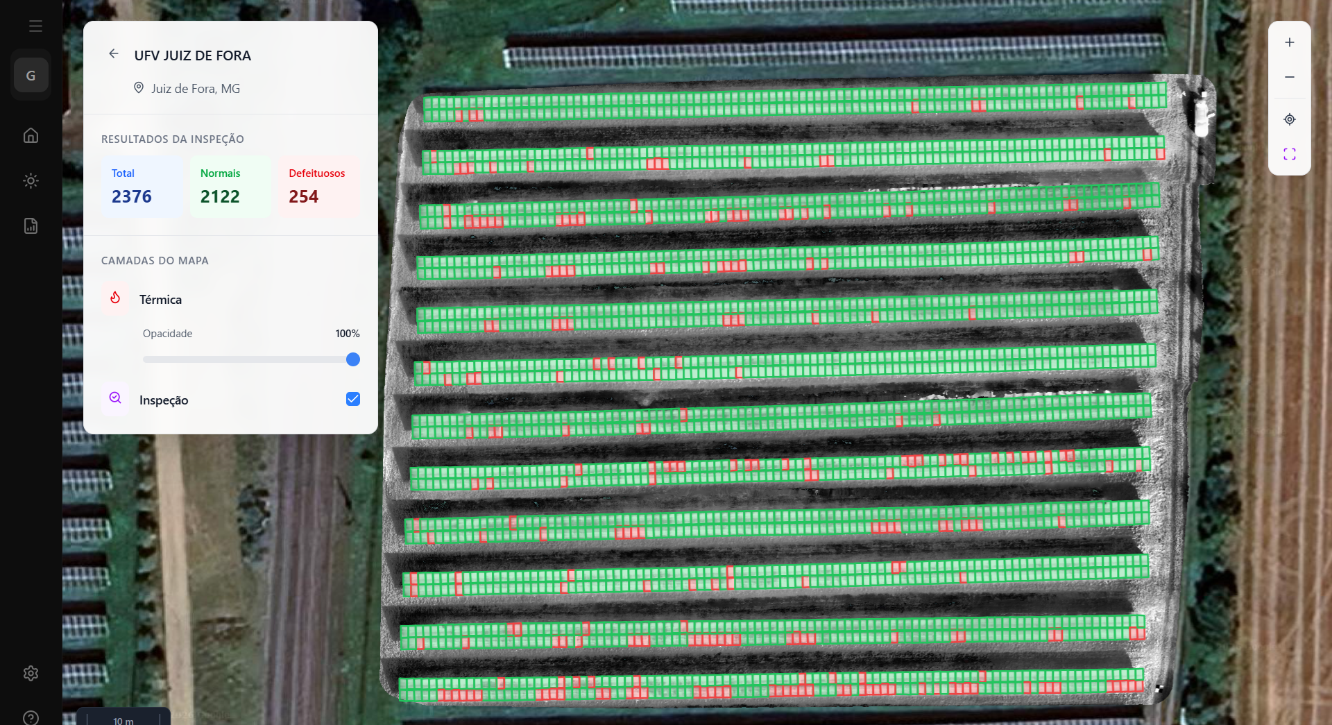 Interface intuitiva para visualizar defeitos no mapa da usina, com filtros por anomalia, severidade e localização.